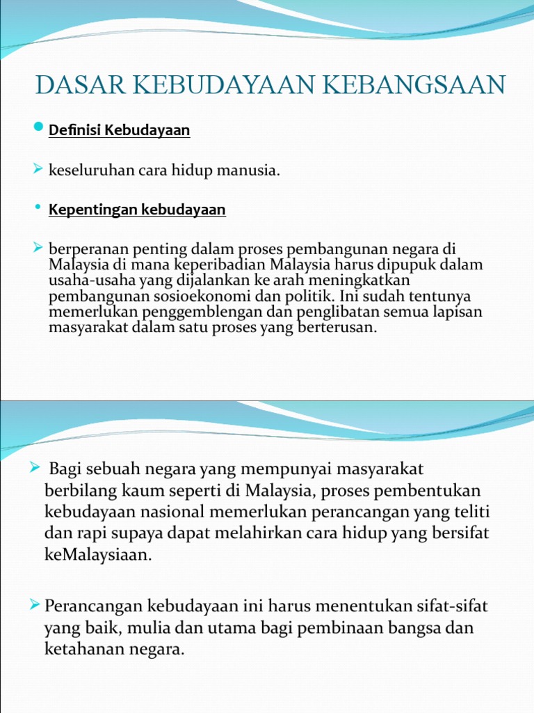 Dasar Kebudayaan Kebangsaan Pengajian Malaysia - Berteraskan kebudayaan rakyat asal rantau melayu sebagai tunjang dasar kebudayaan kebangsaan.. Penggubalan dasar kebudayaan kebangsaan adalah penting bagi sesebuah negara membangun dan yang mempunyai penduduk berbilang kaum seperti malaysia. Peranan generasi muda terhadap dasar kebudayaan kebangsaan. Sewajarnyalah dasar kebudayaan kebangsaan (1971) dihayati oleh setiap warga malaysia dan dijadikan panduan serta asas penting bagi kita untuk memartabatkan warisan seni budaya rumpun melayu dan menghormati warisan seni budaya pelbagai etnik di malaysia. • dalam membentuk masyarakat plural yang. Mewujudkan perpaduan negara dan integrasi nasional melalui aspek kesenian dan kebudayaan.